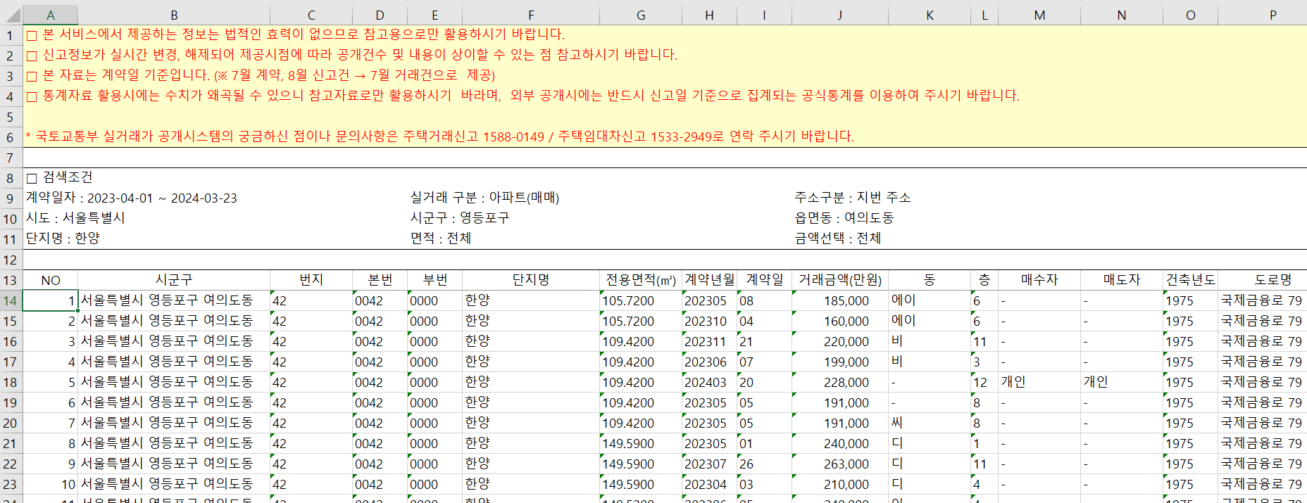 국토교통부 실거래가 조회 조건별 자료제공 시스템에서 최근의 여의도 한양아파트 매매를 엑셀로 다운로드 할 수 있습니다. 2023년 4월부터 2024년 3월까지 거래내역은 아래의 엑셀 파일 다운로드를 클릭하세요.