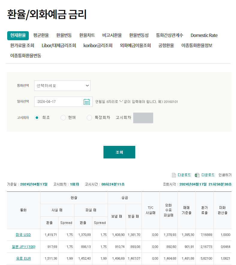 | 하나은행 실시간 환율 조회 링크, 환율, 매매기준율, 고시 차수 918회 (0) | 2024.04.19 |