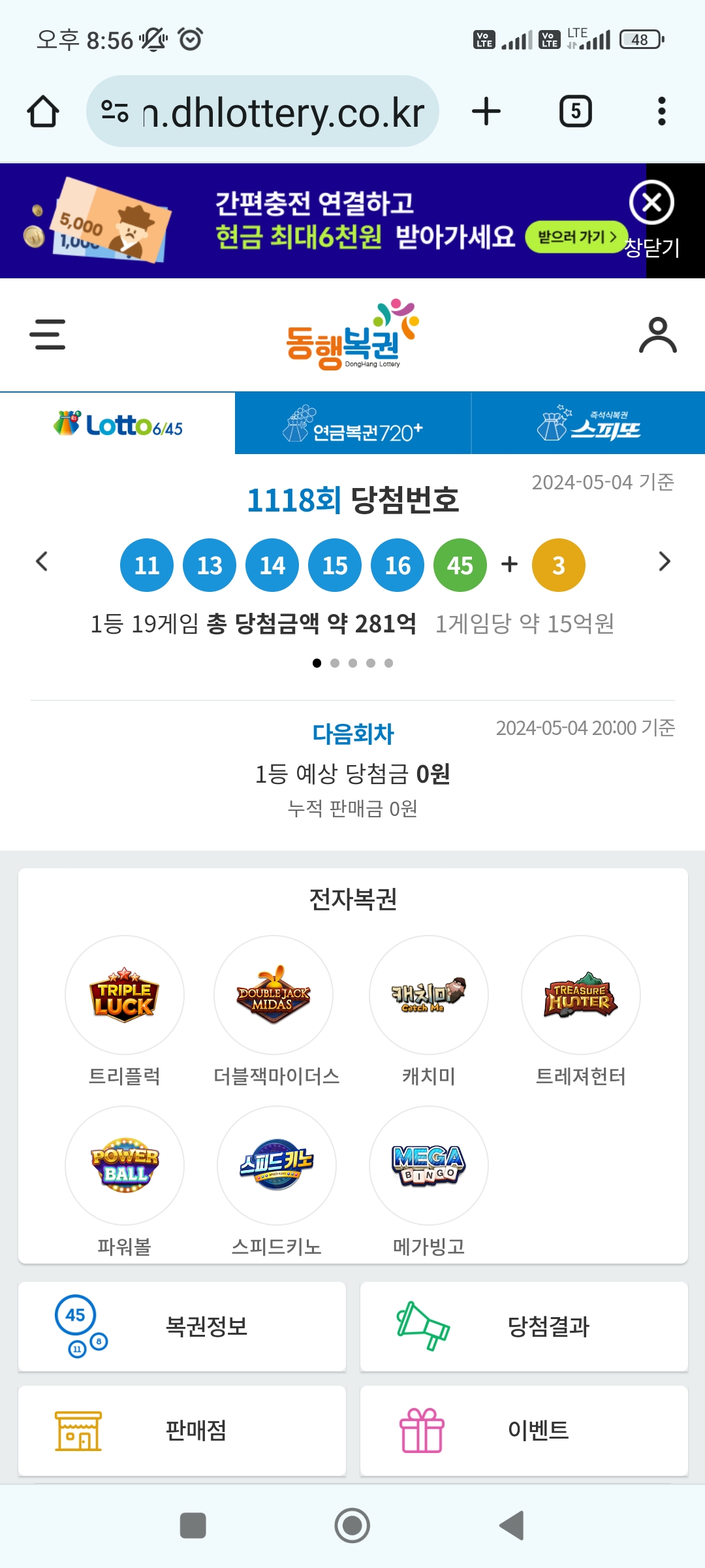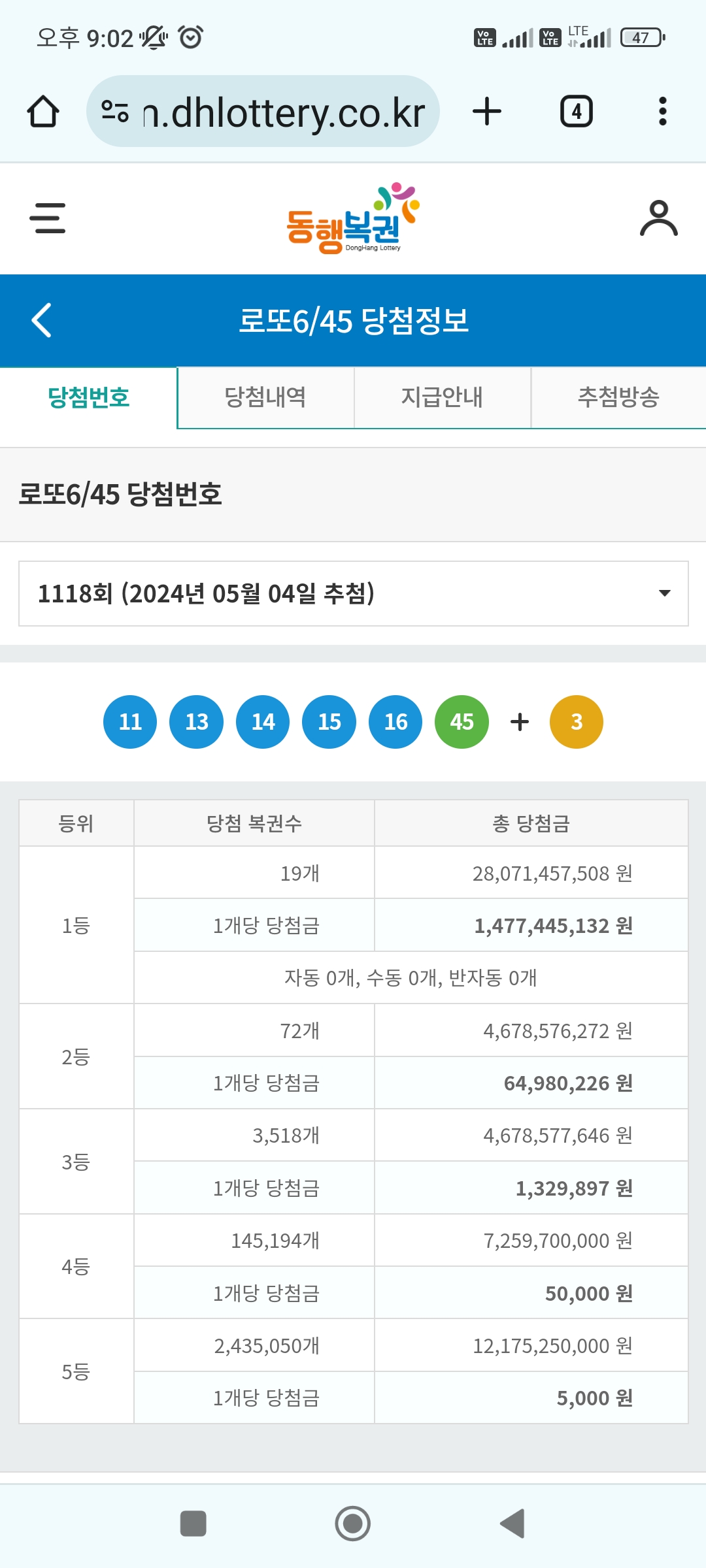 당첨번호 : 11, 13, 14, 15, 16, 45 + 보너스 번호 3